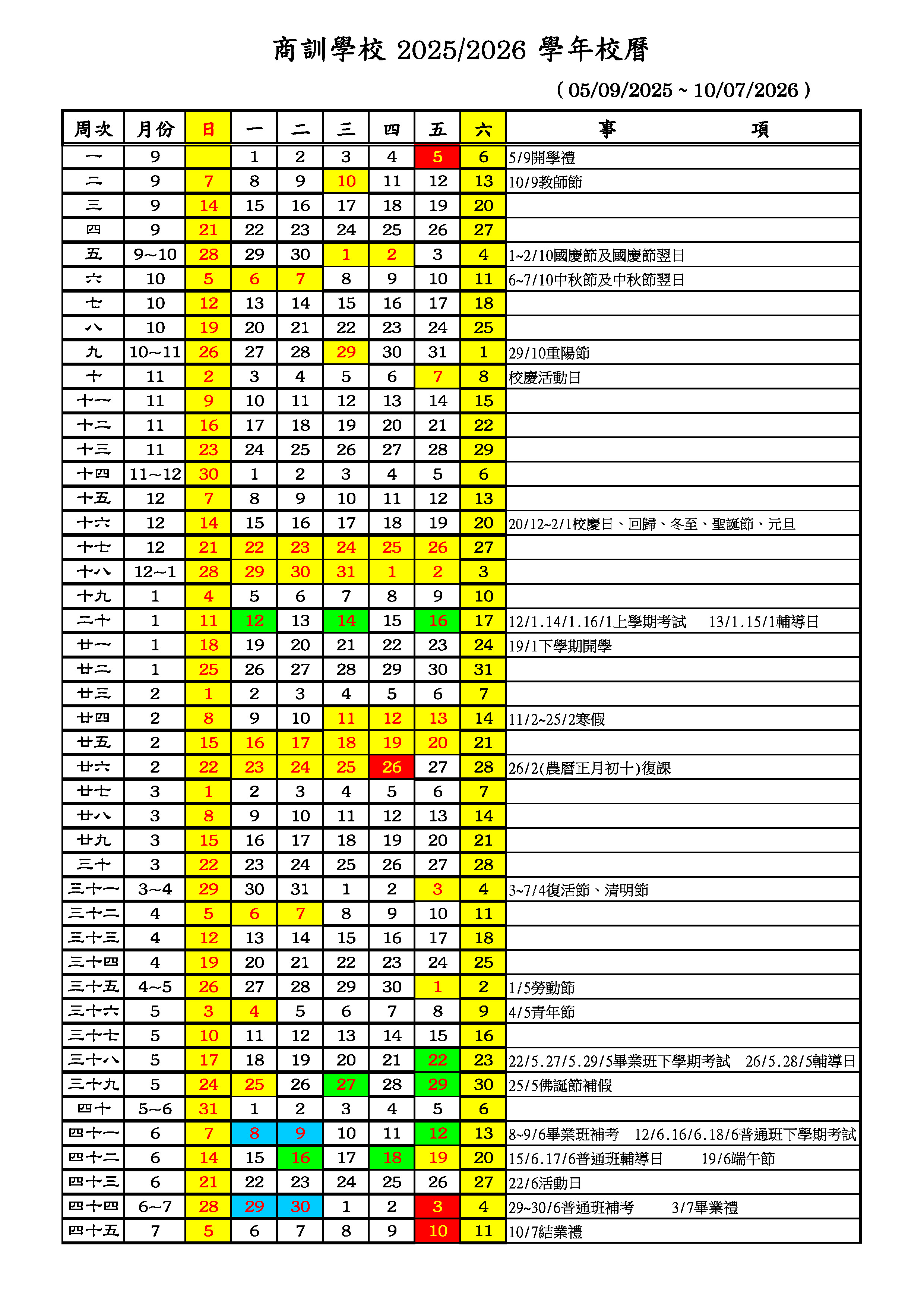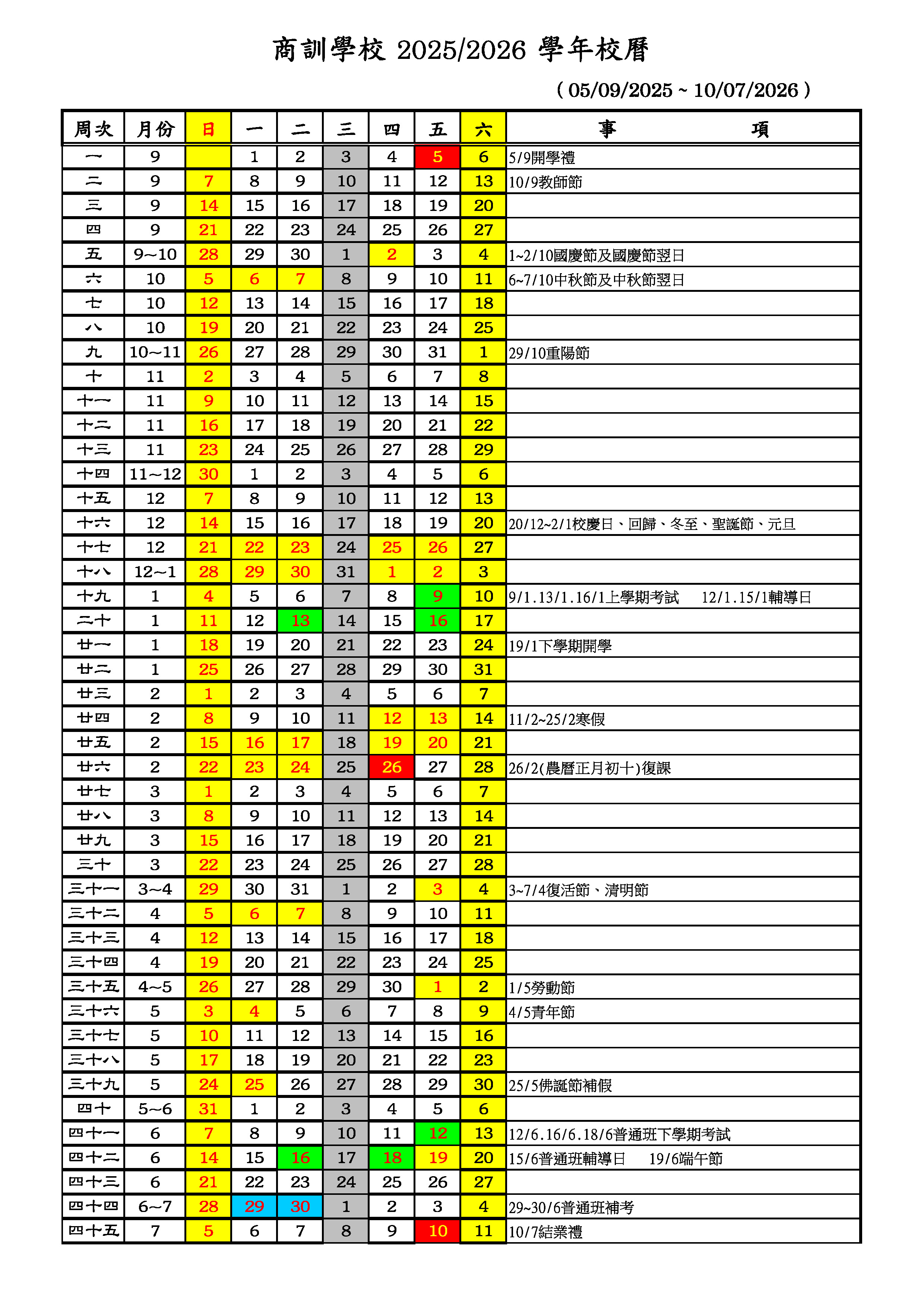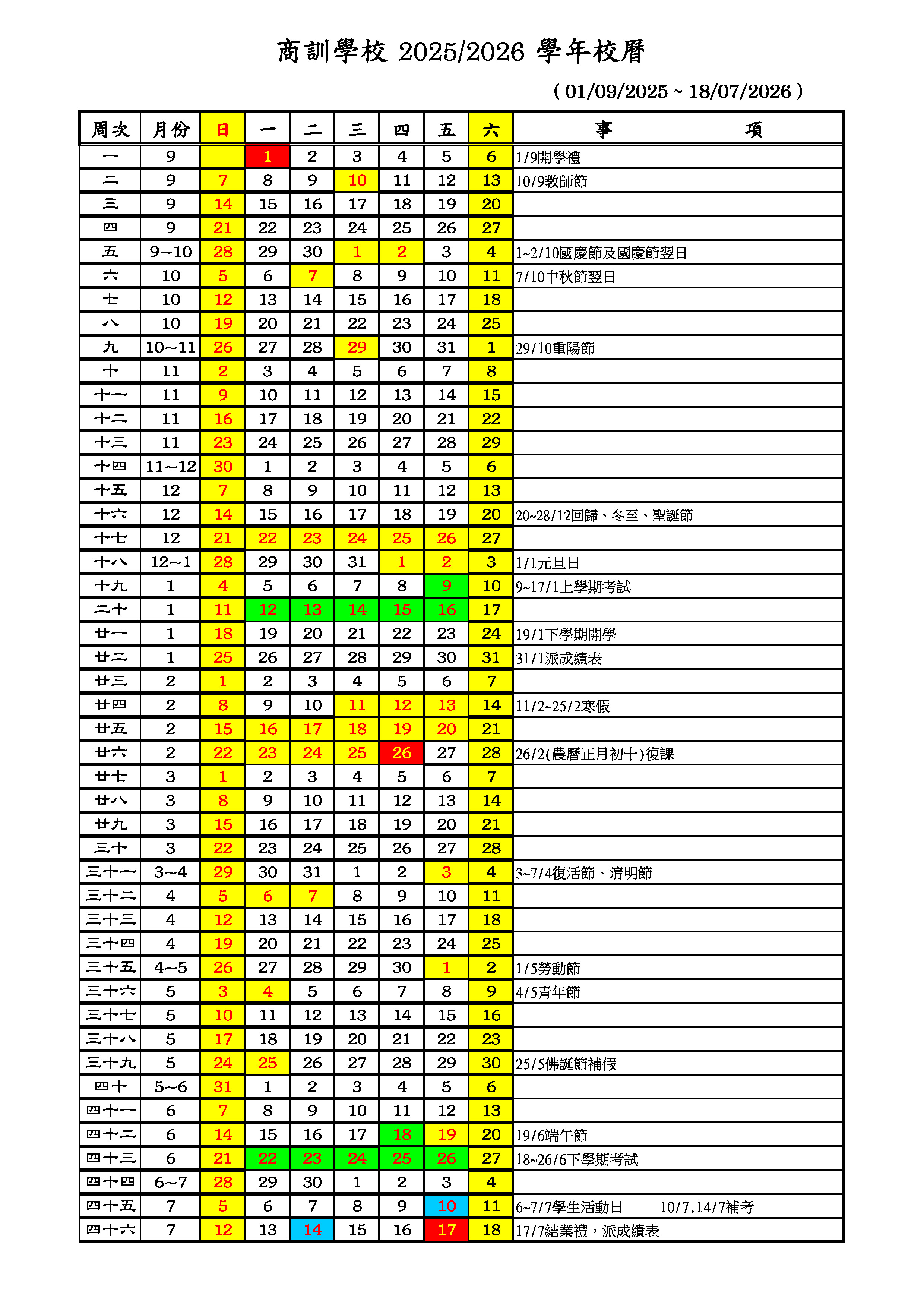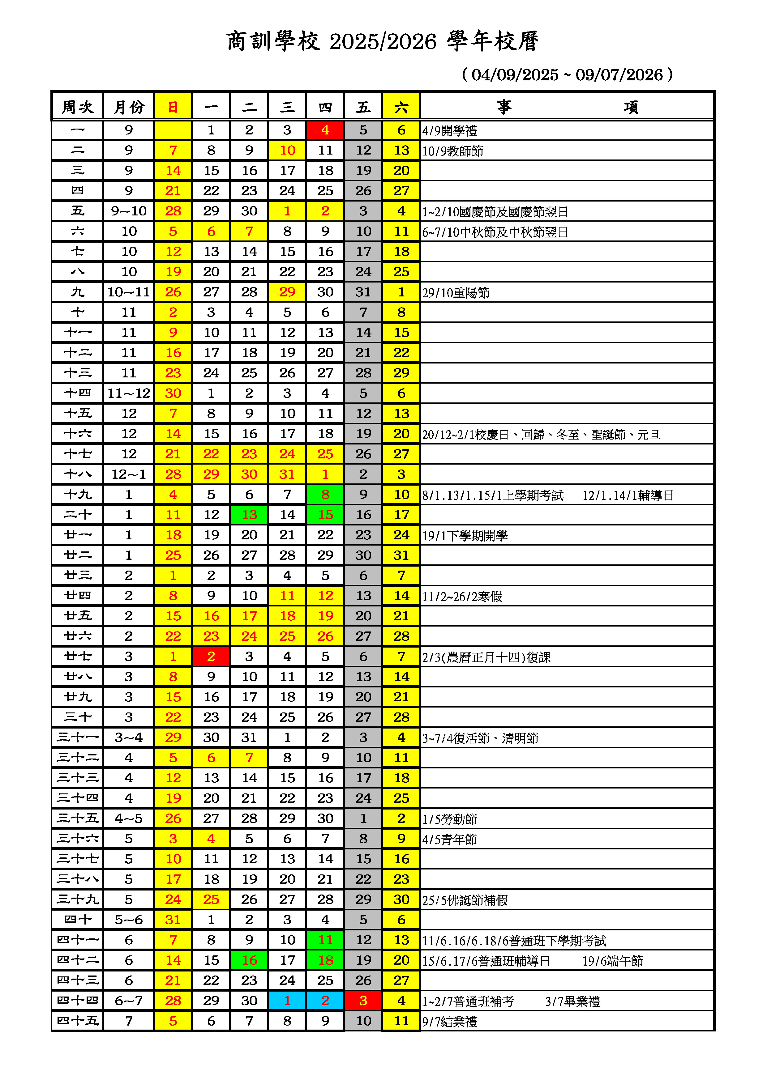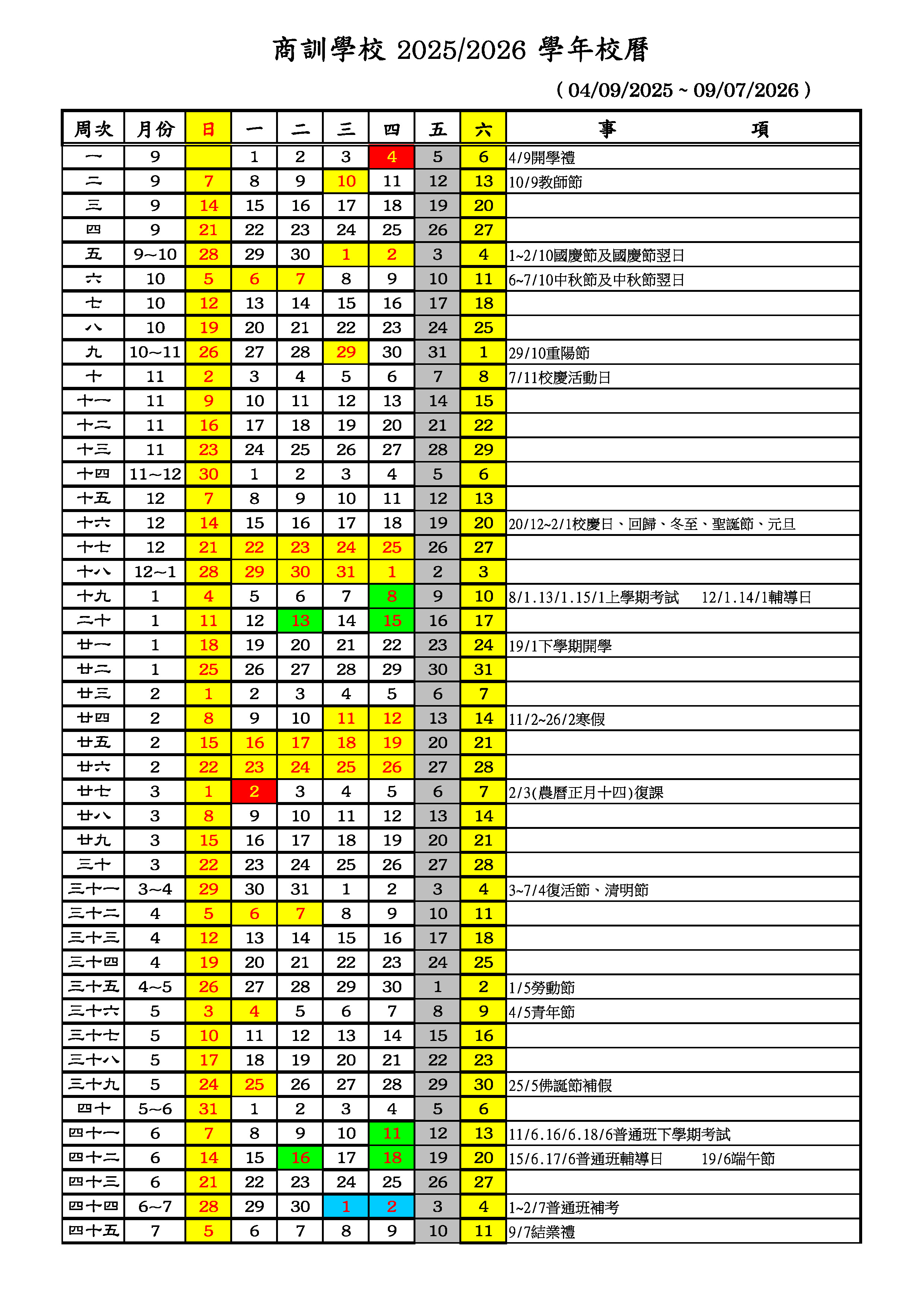 學校正規教育課程校歷表