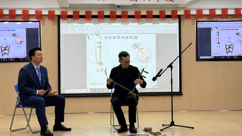 活動內容包括京劇知識講解、樂器展示和經典劇曲欣賞。現場詳細介紹了京胡、月琴等京劇主要伴奏樂器,並由北京伯言教育科技公司董事長、北京靜安軒書畫院院長韓寧寧教授、中央電視台著名主持人趙保樂老師、國家京劇院一級演員畢小洋老師、國家一級演奏員葉光老師、國家京劇院、國家一級演員張浩洋老師進行了生動的演奏示範,讓同學們直觀地感受到京劇藝術的獨特魅力。