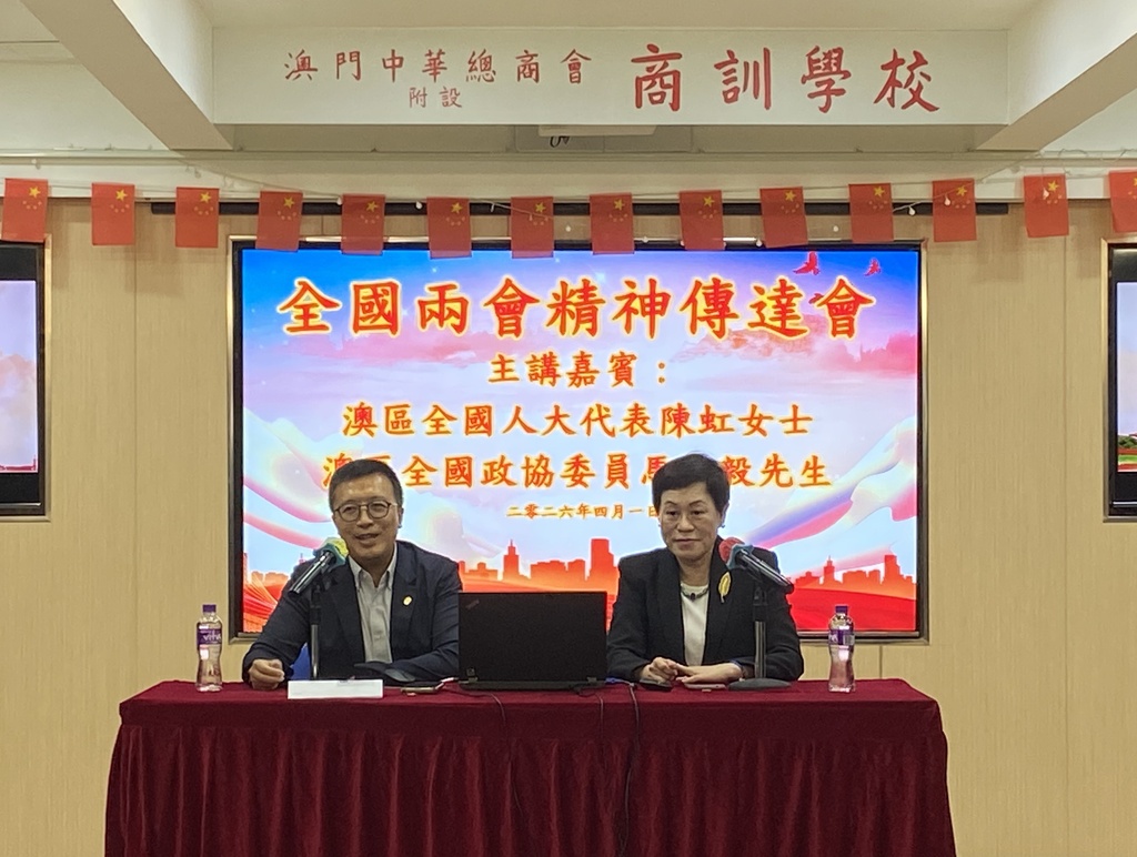 4月1日晚,澳門中華總商會附設商訓學校於禮堂舉行2026年全國兩會精神傳達會,特邀澳區全國政協委員、校董會主席馬志毅先生,澳區全國人大代表陳虹女士作主題分享,與全校師生共同解讀兩會熱點、分享履職見聞、傳遞使命擔當。澳門中華總商會教育顧問高展鴻先生,澳門中華總商會附設青洲中學張捷校長、廖玉光副校長,商訓校友會婁傳奎會長、冼偉安名譽會長、高展明副會長、黃玉常副會長,以及本校與青洲中學行政團隊、商訓學校全體教職員工及同學亦出席本次活動。