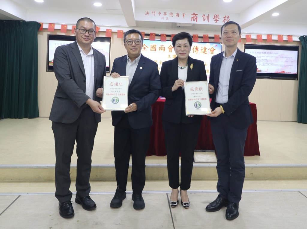 會後,張捷校長和李雪松代校長向兩位嘉賓致送感謝狀。本次活動進一步加強愛國愛澳教育,引導師生以兩會精神為指引,勇擔時代使命,為澳門繁榮穩定、民族復興貢獻力量。