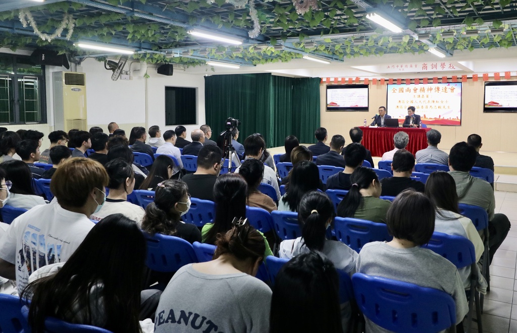4月1日晚,澳門中華總商會附設商訓學校於禮堂舉行2026年全國兩會精神傳達會,特邀澳區全國政協委員、校董會主席馬志毅先生,澳區全國人大代表陳虹女士作主題分享,與全校師生共同解讀兩會熱點、分享履職見聞、傳遞使命擔當。澳門中華總商會教育顧問高展鴻先生,澳門中華總商會附設青洲中學張捷校長、廖玉光副校長,商訓校友會婁傳奎會長、冼偉安名譽會長、高展明副會長、黃玉常副會長,以及本校與青洲中學行政團隊、商訓學校全體教職員工及同學亦出席本次活動。